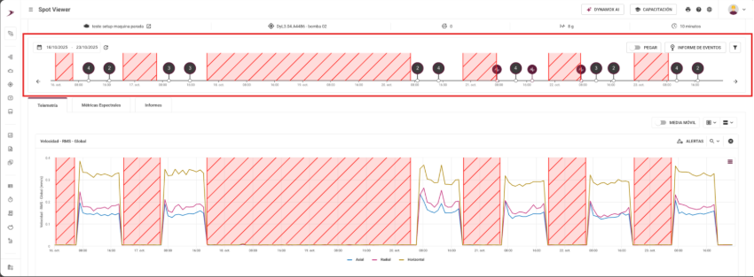 Asegurá que solo se recolecten, analicen y almacenen datos relevantes, alineando la captura espectral con el funcionamiento del activo. Esta funcionalidad permite que el sistema reprograme automáticamente las colectas espectrales al detectar, con base en los niveles de operación configurados en el Spot, que la máquina está detenida.