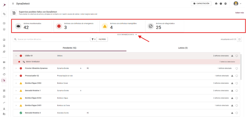 Los indicadores de activos vuelven a estar disponibles en la pantalla inicial de DynaDetect. Al acceder a DynaDetect, podrás visualizar de forma simple y rápida los indicadores de activos monitoreados, activos con defecto emergencial, activos con defecto gestionable y activos sin diagnóstico.