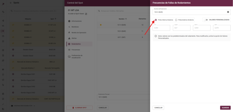 Ahora puedes elegir si la pista giratoria del rodamiento es interna o externa. Con esta configuración, el sistema calcula la frecuencia de falla de la jaula, actualizando marcadores y métricas para análisis aún más precisos y confiables.