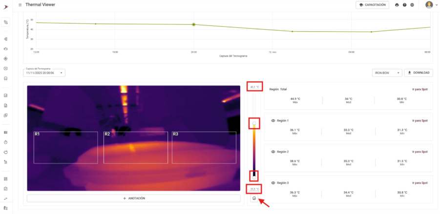 La escala termográfica está aún mejor, brindándote mayor control en tus análisis térmicos. La escala de temperatura sigue automáticamente los valores máximo y mínimo del termograma. Con esta novedad, puedes ajustar esos límites manualmente con el cursor o definir los valores que desees, lo que garantiza análisis mucho más precisos y personalizados.